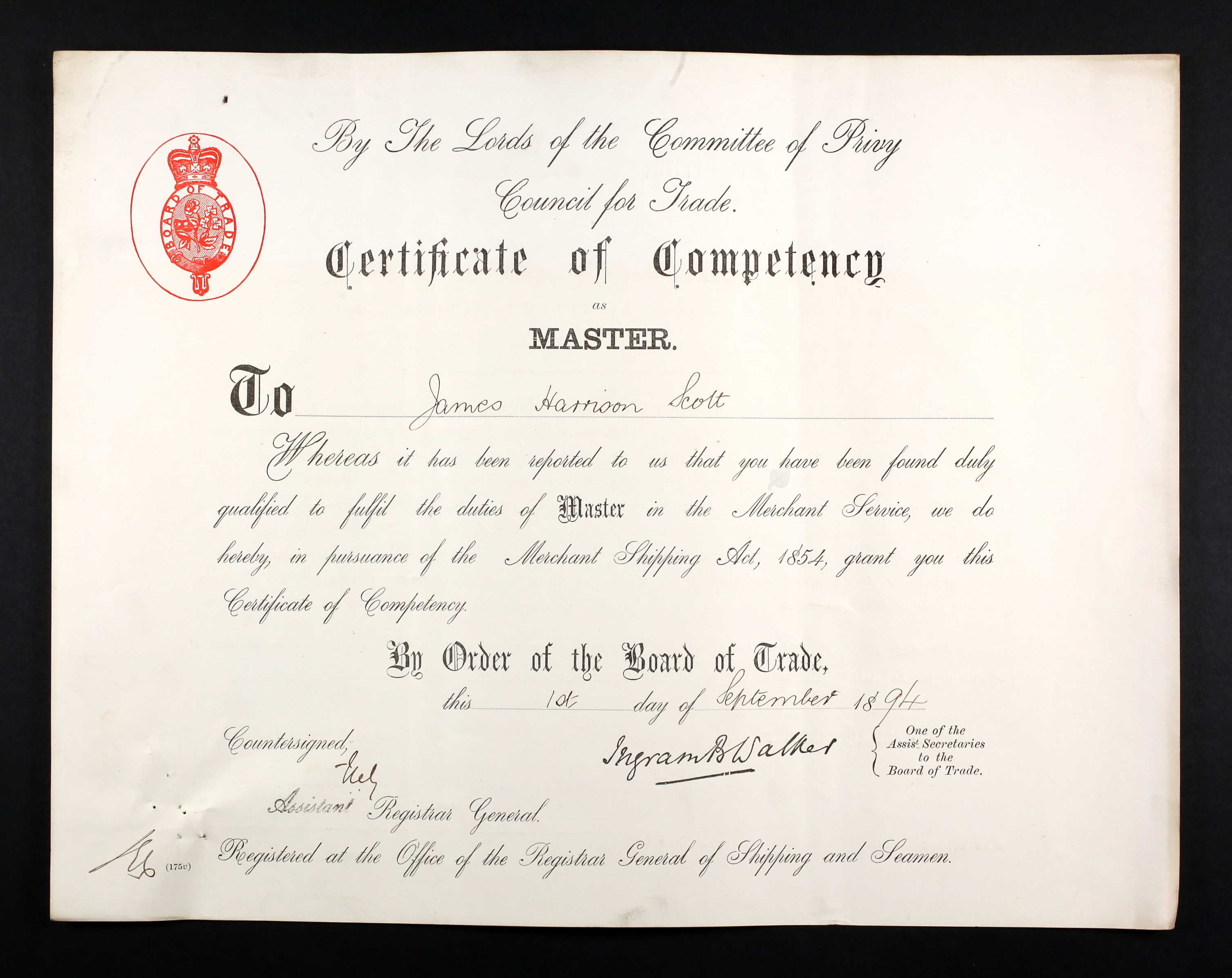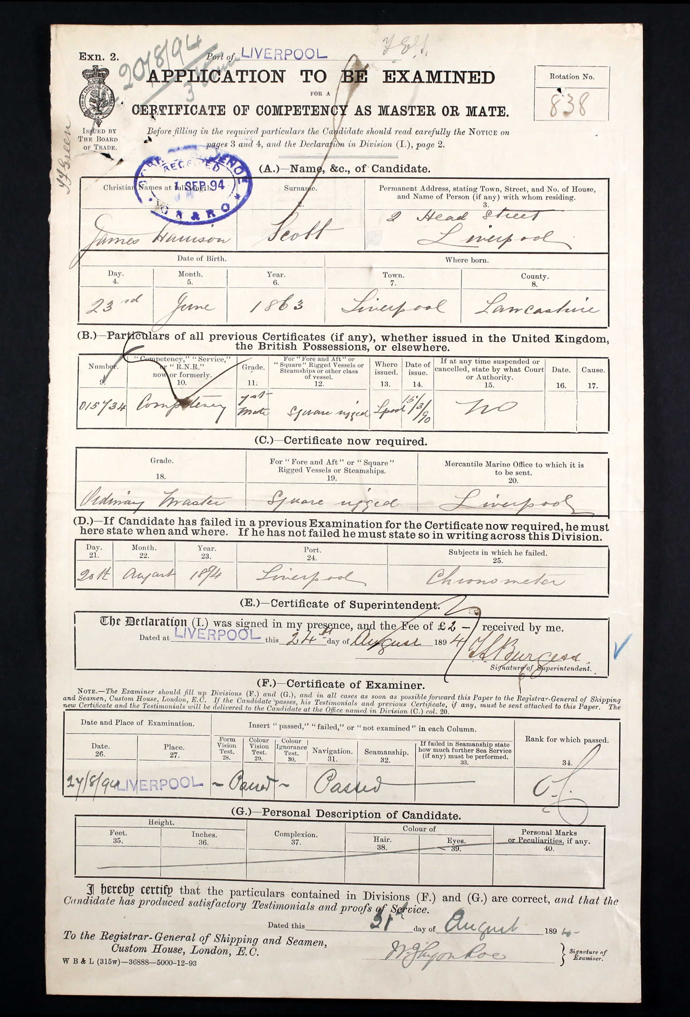He failed his first attempt on 20th August on the Chronometer subject, but passed when he retook on 24th. At this time James and Maggie’s oldest child Lilian was around a year old, and nine months after passing the exam Henry Murdoch was born. Their address was still with Maggie’s parents at 2 Head Street. Her two younger sisters Eliza and Ada were probably also still at home.