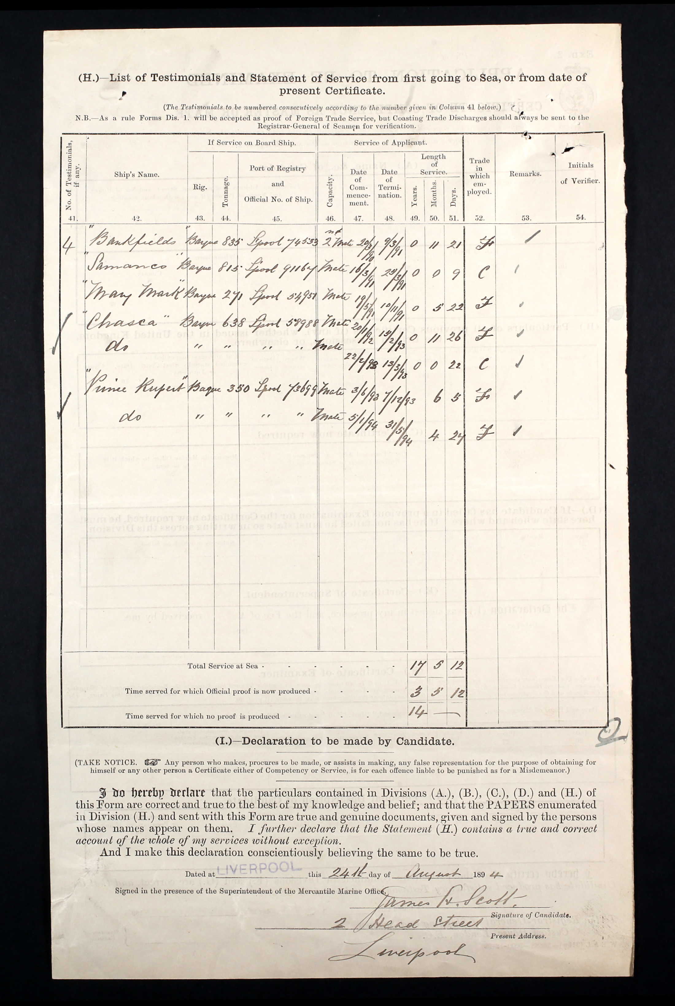 James Harrison sailed for two voyages on the Prince Rupert, from 3 June 1893 – 7 December 1893 and 5 January 1894 – 31 May 1894. There were several ships with that name in the 1890s so I haven’t been able to trace her voyages yet, but we know from his application for a Master’s certificate that she was engaged in the foreign trade. Her entry in Lloyd’s register shows she ran aground and was wrecked a year after James left her.