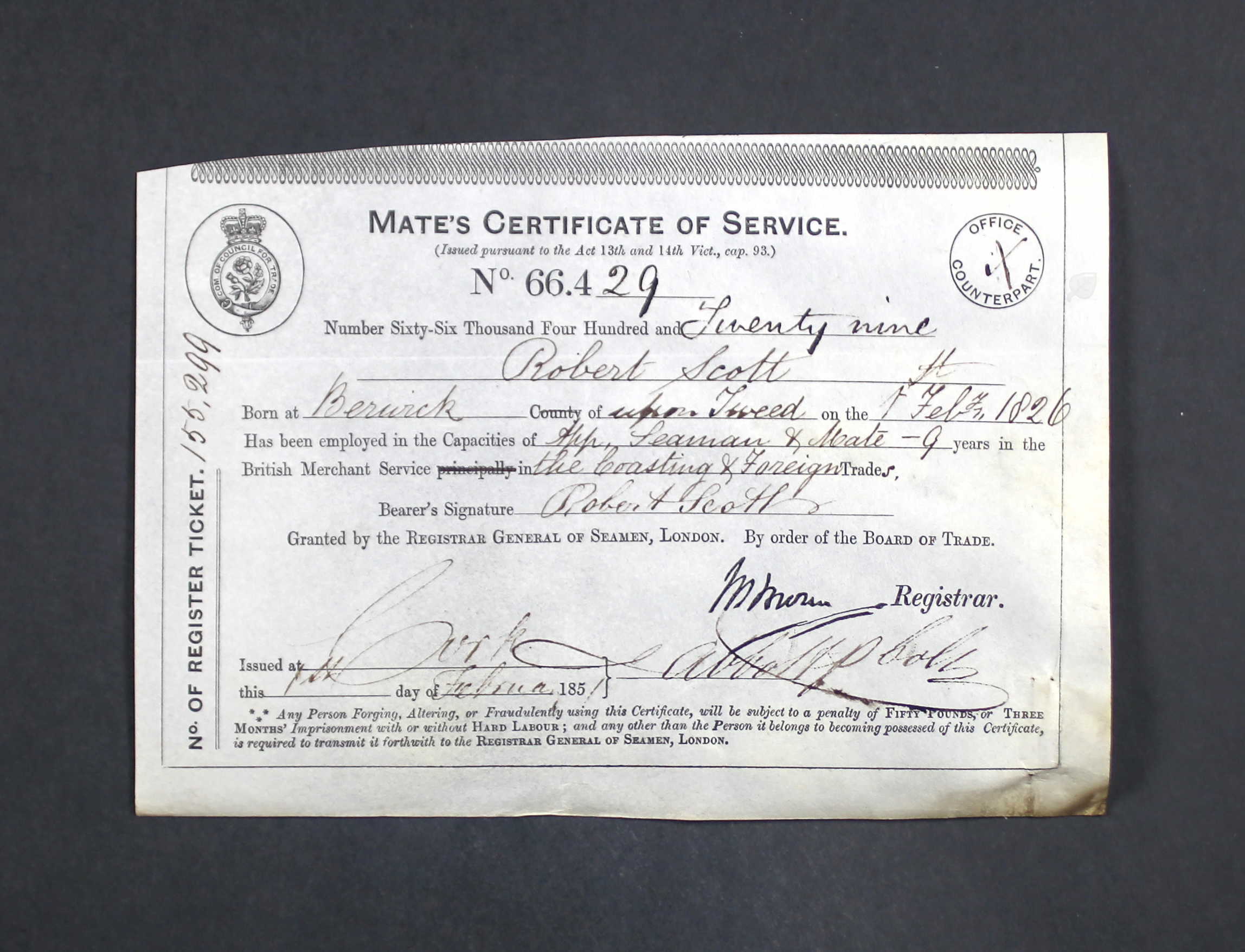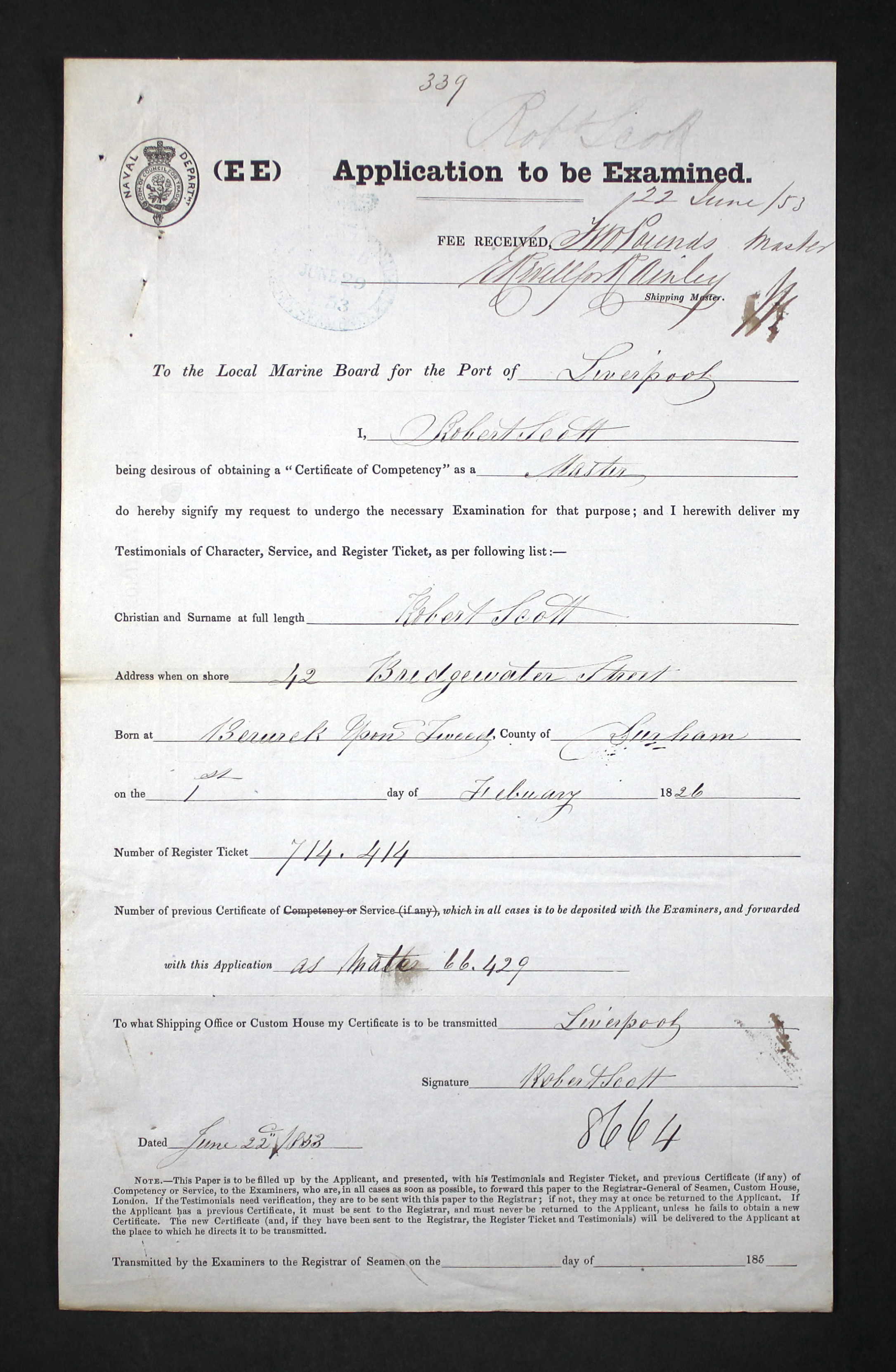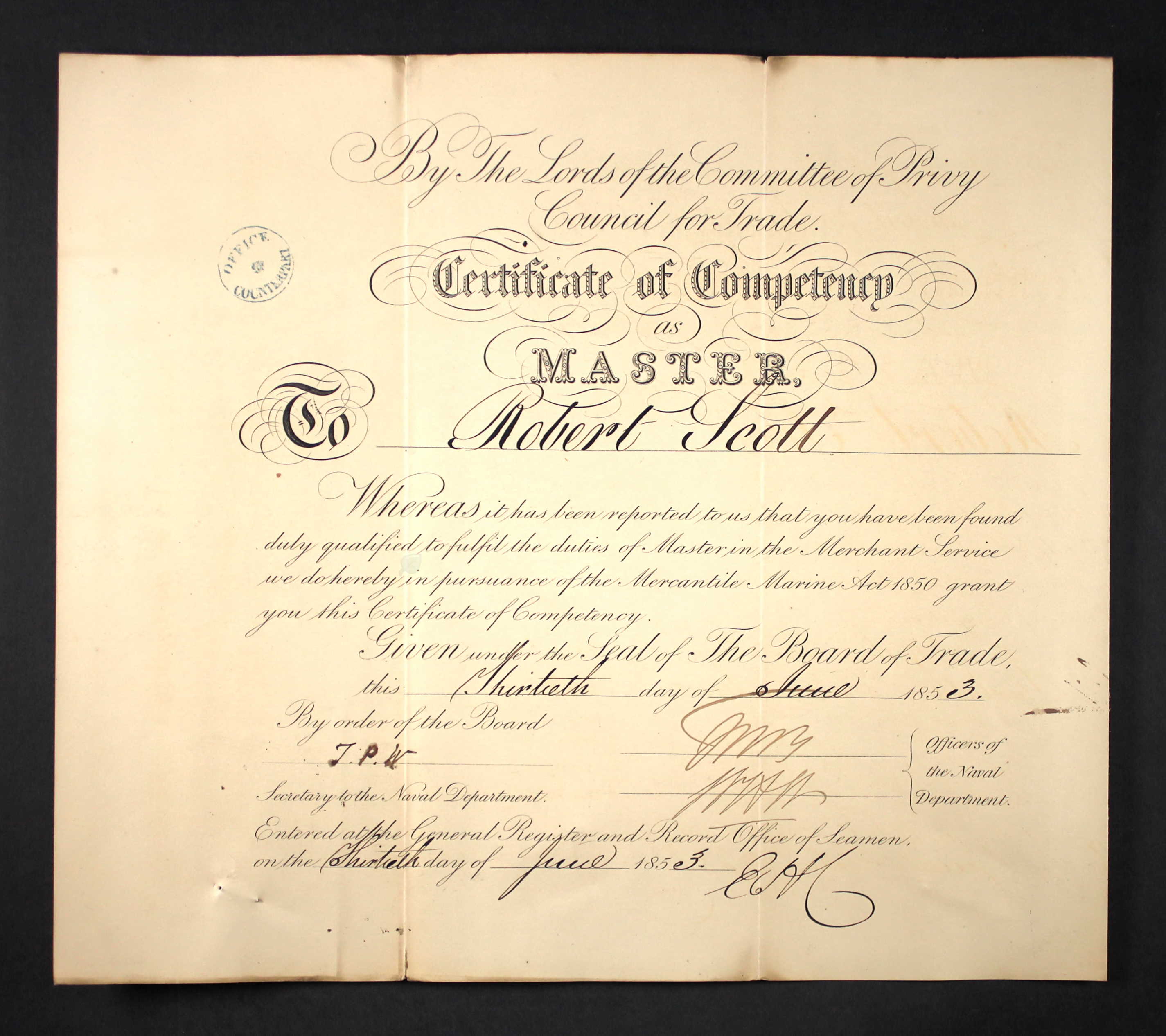 Robert’s next berth from 24 August 1852 – 22 June 1853 was as Mate on the Briton.I don’t know which trade she plied, but as a Fleetwood registered vessel perhaps he was not away for such long periods as on his previous voyages. Whatever experiences he had, he clearly felt ready to move up a rank, and in June 1853 he sat and passed his Master’s examination.