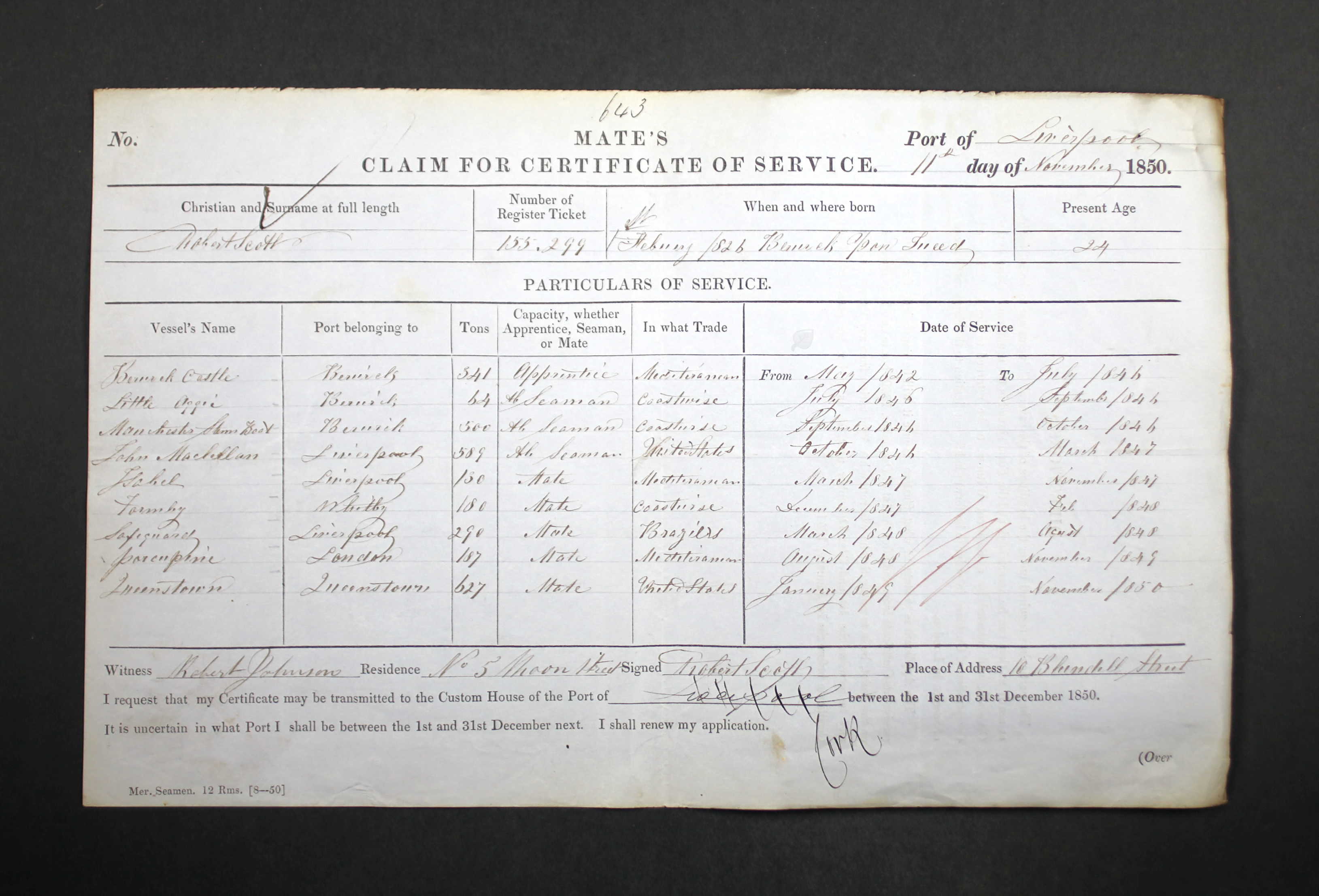 Robert had a short berth as an AB on Little Aggie, a 64 ton schooner from July 1846. From September to October 1846 he worked aboard the Manchester, a 500 ton steamer coastwise to London.